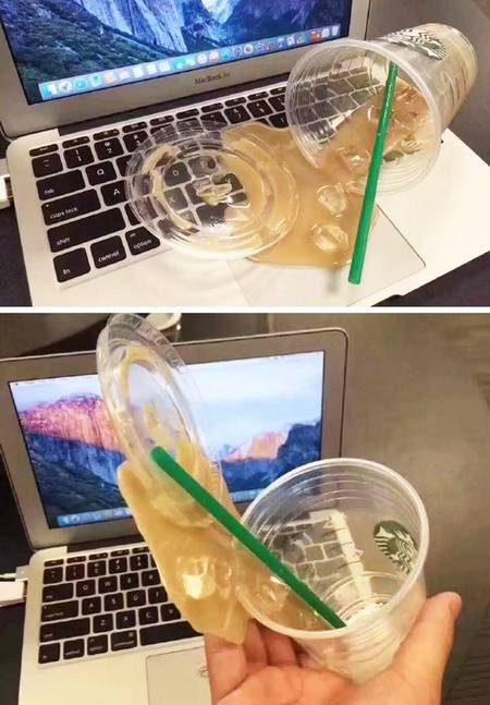 Brilian! Bisa kamu bayangkan seperti apa reaksi temanmu saat mendapati laptopnya terendam Starbucks?
