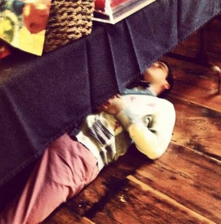Tak mampu menahan kantuk, Darren Criss mendadak tidur di bawah meja saat di lokasi syuting Glee. Kira-kira kenapa ya memilih lokasi di bawah meja?