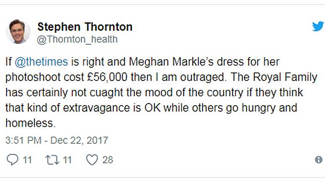 "Jika @thetimes benar dan gaun Meghan Markle untuk pemotretannya seharga £ 56.000 maka saya marah. Keluarga Kerajaan tentu saja tidak menyukai suasana negara jika mereka menganggap pemborosan semacam itu baik-baik saja sementara yang lain sedang lapar dan tidak memiliki tempat tinggal."