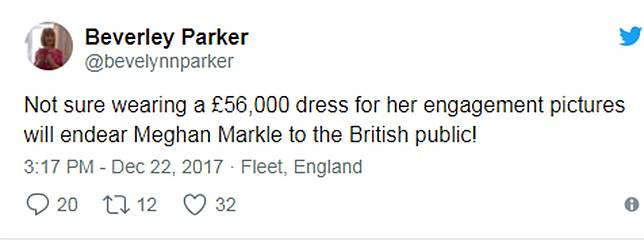 "Tidak yakin mengenakan gaun seharga £ 56.000 untuk foto pertunangannya akan menimbulkan perasaan cinta Meghan Markle kepada publik Inggris!"