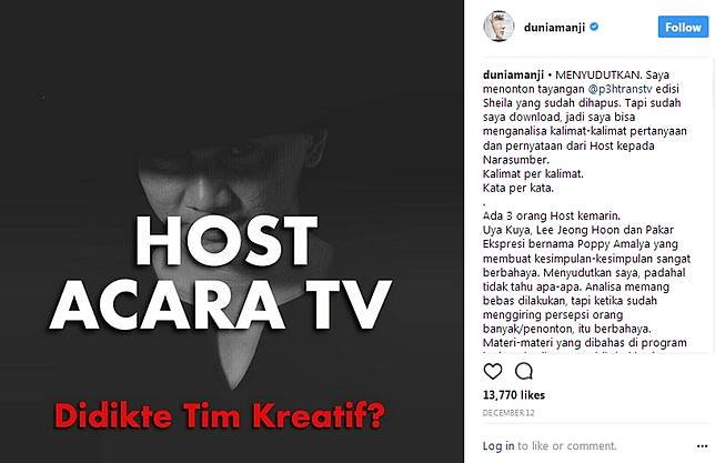 "Poppy dan Lee, itu memprovokasi, menghasut, dengan memberikan sebuah pertanyaan dan pernyataan. Lee menggiring pernyataan yang menggiring opini, Poppy memberikan pernyataan yang menghasut dan juga menggiring opini. Jadi di sini jelas, host memihak," sambung Anji.