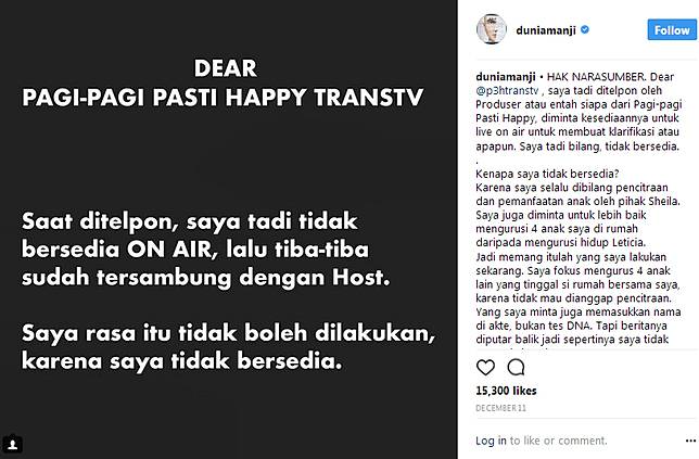 Pelantun lagu Dia itu sempat curhat panjang di Instagram mengenai kasus ini. Anji bahkan sudah lapor ke Komisi Penyiaran Indonesia (KPI) karena menurutnya pihak Trans TV telah menyalahi pasal 28 ayat 1 Pedoman Perilaku Penyiaran dan Standard Program Siaran (P3SPS).